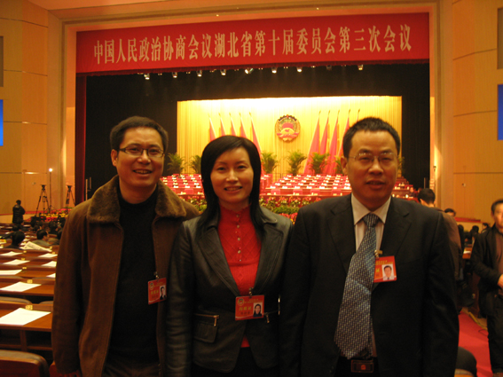 图为总裁潘世炳与武汉市人民检察院副检察长周佳念(左)、武汉理工大学博导陈晓芳(中)教授在政协会上合影